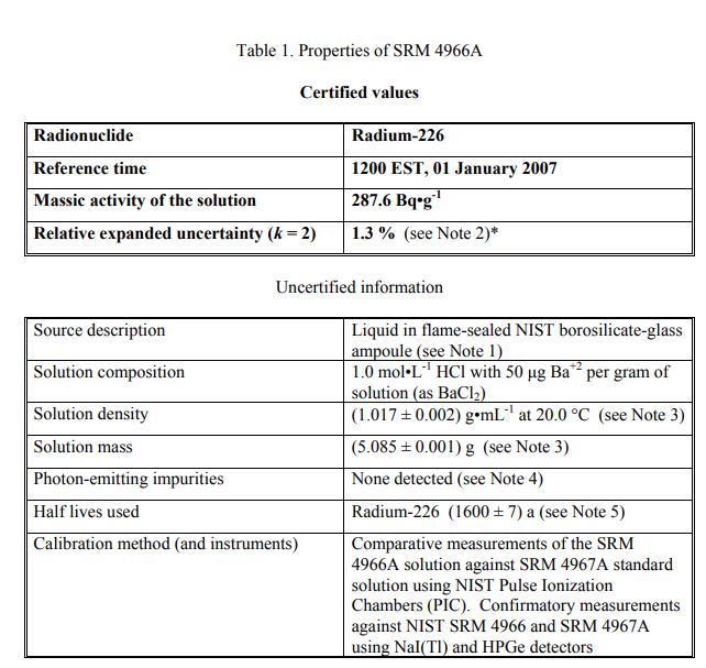 在 2007 年 1 月 1 日美國(guó)東部標(biāo)準(zhǔn)時(shí)間 1200 的參考時(shí)間,經(jīng)認(rèn)證的 Radium-226 質(zhì)量活度值為:(287.6 ± 3.7) Bq?g-1