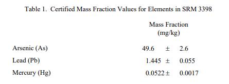表 1 提供了 SRM 3398 中基于干質(zhì)量報告的痕量元素認(rèn)證質(zhì)量分?jǐn)?shù)值。NIST 認(rèn)證值是 NIST 對其準(zhǔn)確性有最高信心的值已知或可疑的偏倚來源已被調(diào)查或考慮 [1]。價值分配分析由 NIST 和合作實驗室進(jìn)行。認(rèn)證值計算為 NIST 方法平均值的未加權(quán)平均值和合作實驗室平均值的加權(quán)中值(在適當(dāng)?shù)那闆r下)。相關(guān)的不確定性以大約 95% 的置信水平表示 [2-5]。