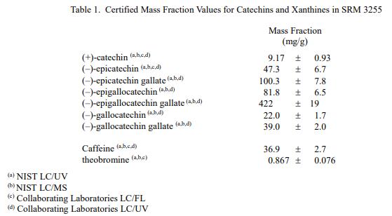 表 1 和表 2 提供了 SRM 3255 中兒茶素、黃嘌.呤和元素的認(rèn)證質(zhì)量分?jǐn)?shù)值,以干質(zhì)量為基礎(chǔ)報(bào)告。NIST 認(rèn)證值是 NIST 具有最高置信度的值在其準(zhǔn)確性方面,所有已知或可疑的偏差來(lái)源都已被調(diào)查或考慮 [1]。價(jià)值分配分析由 NIST 和合作實(shí)驗(yàn)室進(jìn)行。兒茶素和黃嘌.呤的認(rèn)證值是各組結(jié)果的同等加權(quán)平均值;元素的認(rèn)證值計(jì)算為 NIST 方法的平均值的平均值和合作實(shí)驗(yàn)室提供的結(jié)果平均值的中位數(shù)(如果適用)。相關(guān)的不確定性以大約 95% 的置信水平表示 [2-4]。