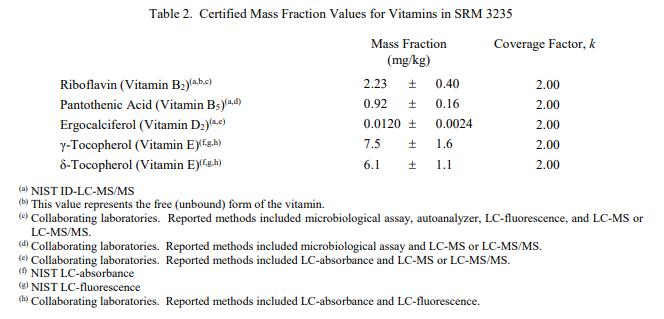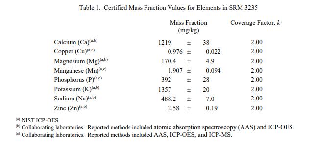 表 1 和表 2 提供了 SRM 3235 中元素和維生素的認證質(zhì)量分數(shù)值,按原樣報告,在表 1 和表 2 中提供。 NIST 認證值是 NIST 對其最有信心的值準確性,因為所有已知或可疑的偏差來源都已被調(diào)查或考慮到[1]。價值分配分析由 NIST 和合作實驗室進行。