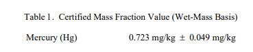 表 1 中提供了汞的認(rèn)證值,表示為基于濕質(zhì)量(原樣)的質(zhì)量分?jǐn)?shù) [1]。該值基于使用冷蒸氣同位素稀釋的主要方法進(jìn)行的分析電感耦合等離子體質(zhì)譜 (CV-ID-ICP-MS) [2,3]。 NIST 認(rèn)證值是 NIST 對(duì)其準(zhǔn)確性具有最高置信度的值,因?yàn)樗幸阎蚩梢傻钠顏?lái)源都已被調(diào)查或考慮 [4]。認(rèn)證值的不確定度以擴(kuò)展不確定度的形式給出,以大約 95% 的置信度覆蓋被測(cè)量。擴(kuò)展的不確定性計(jì)算為 U = kuc 其中uc 是與 ISO/JCGM 指南 [5] 一致的組合不確定度,k 是對(duì)應(yīng)于大約 95% 置信度的覆蓋因子 (k = 2)。被測(cè)量是表 1 中列出的汞的總質(zhì)量分?jǐn)?shù)。計(jì)量可溯源至 SI 派生的質(zhì)量分?jǐn)?shù)單位(以毫克每千克表示)